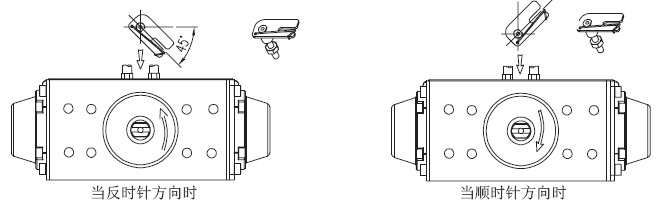 3,把執(zhí)行機構軸的回轉位置對準起始位置,即開度的0%位置。當執(zhí)行機構是利用彈簧的單作用氣缸時,如果不輸入氣源壓力,則氣缸軸始終返回到起始點,因此很容易確認。當雙作用氣缸時,請參照氣缸說明書,確認是順時針旋轉還是逆時針旋轉,或輸入空壓時氣缸軸的回轉方向來判斷。